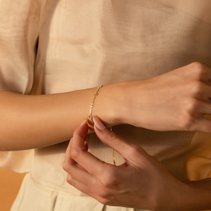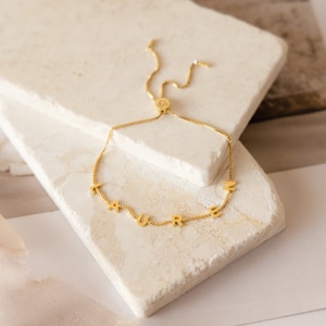 Customize your own minimalist Initial Bracelet with the name of your choice, to create a truly unique gift. The chain is adjustable and can be personalized with dainty letter charms that spell out a name or any combination of initials to represent all of your loved ones.